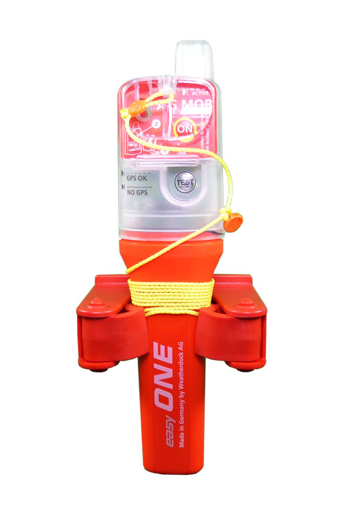 Whether on the deck or directly in the companionway, with the flexible holder the easyONE or easyTOO is safely stowed on board and quickly in hand in case of an emergency. The holder is weather-resistant and can be screwed or glued depending on the substrate.