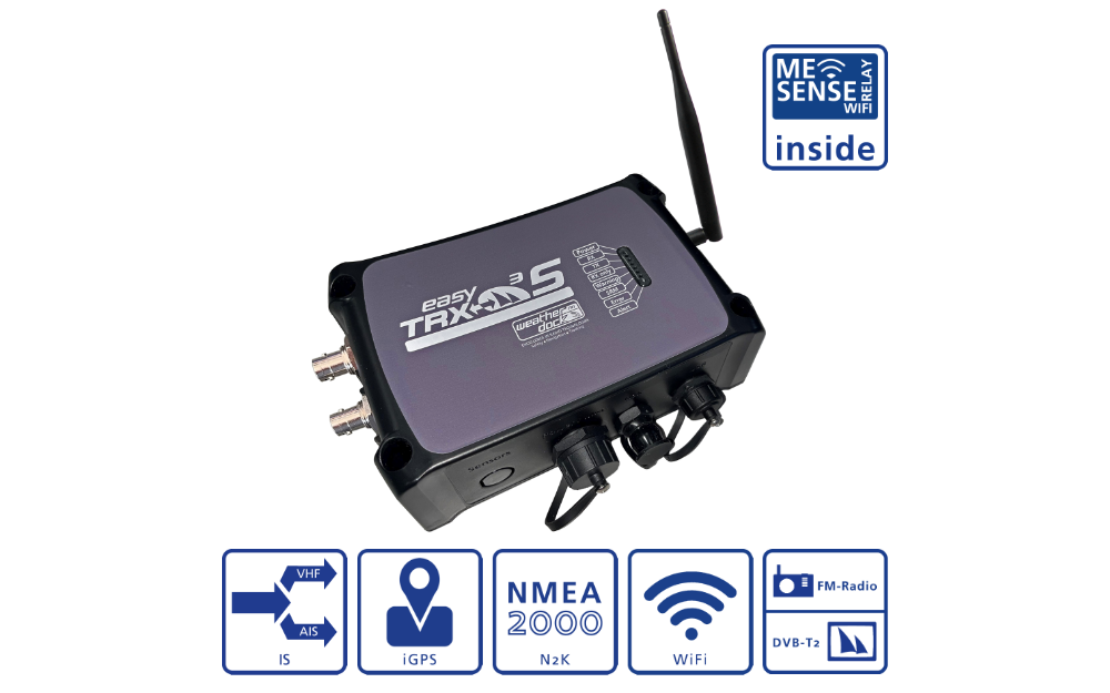 A20023 easyTRX3S-DVBT Jetzt online bestellen zum Shop > p Produktinformation Integrierter Splitter Integrierter GPS Empfänger N2K WiFi DVB-T ME SENSE Bootsüberwachung per App(Relay und Batterie Sensor)-> Weitere Sensoren separat erhältlich Produktbilder DOWNLOADS