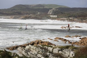 Riders are heading out for their heat through the channel at the Mission 2 of the Red Bull Storm Chase Back in Marrawah at the Back of the Lighthouse, Tasmania on August 19 2013